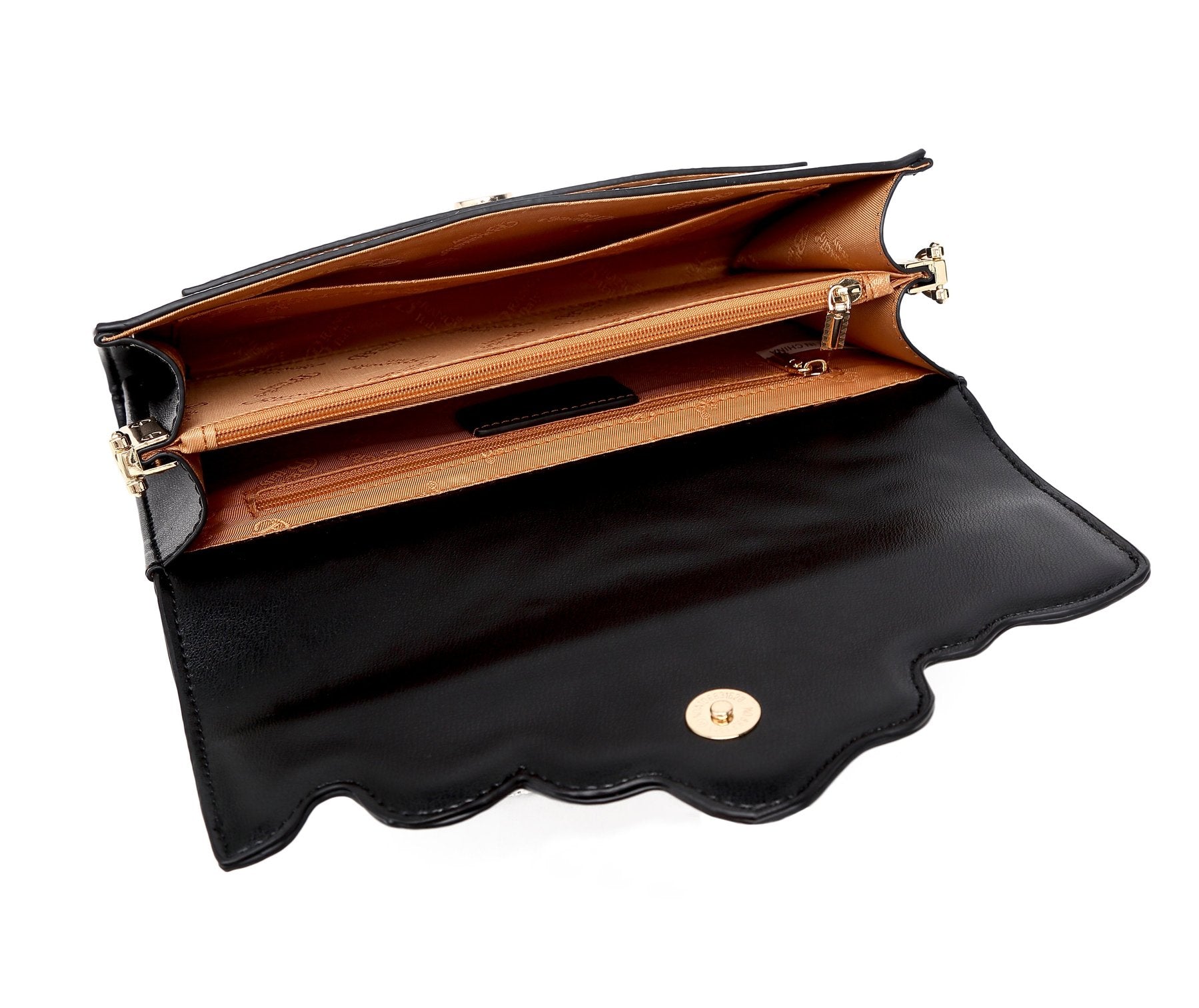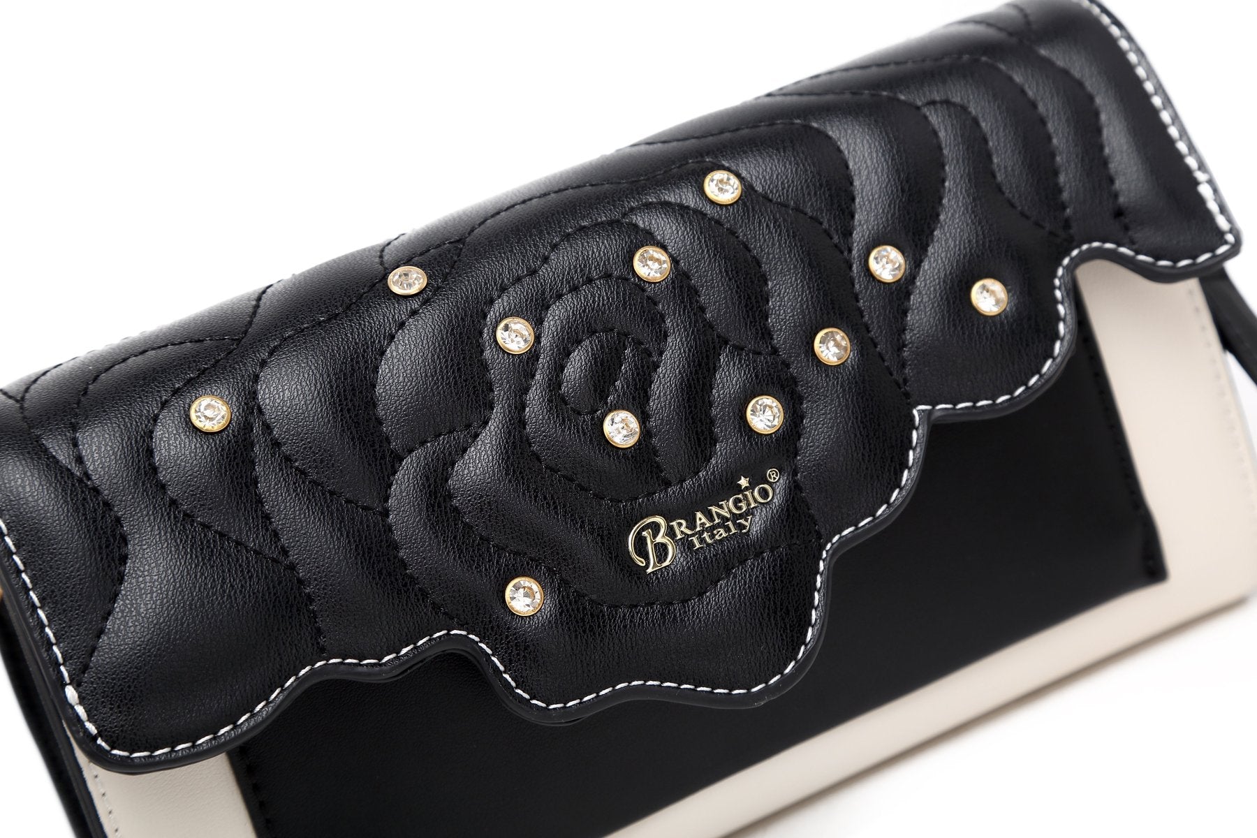 This elegant evening bag takes its unique looks right out of the 1950’s with its two-toned leather stripes. The embroidered rose with crystal studs brings this piece up to fashion in a classy elegant way perfect for special evenings. Even for how small this handbag is, it has all the pockets you’ll need with the zippered center divider.